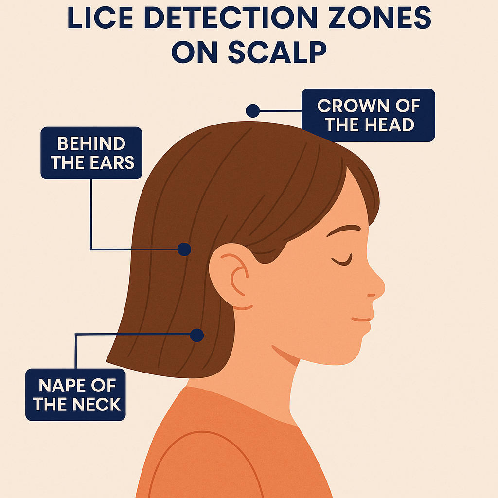 Use a fine-toothed lice comb under bright lighting. Focus on the scalp, behind the ears, and neck.